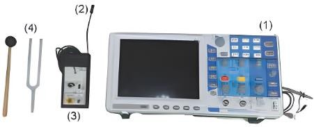 Hình bên là bộ dụng cụ thí nghiệm thực hành đo tần số sóng âm, bao gồm dao động kí điện tử và dây đo (1), micro (2), bộ khuếch đại tín hiệu (3), âm thoa và búa cao su (4). Dụng cụ tạo ra sóng âm trong thí nghiệm trên là