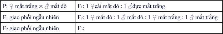 | d) Ở F3, tỷ lệ ruồi mắt trắng so với tỷ lệ ruồi mắt đỏ là 7/9. |