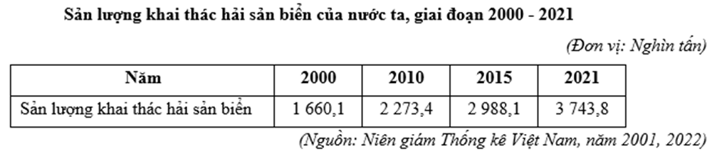 Căn cứ vào bảng số liệu trên, cho biết tốc độ tăng trưởng sản lượng khai thác hải sản biển của nước ta năm 2021 so với năm 2000 (làm tròn kết quả đến hàng đơn vị).