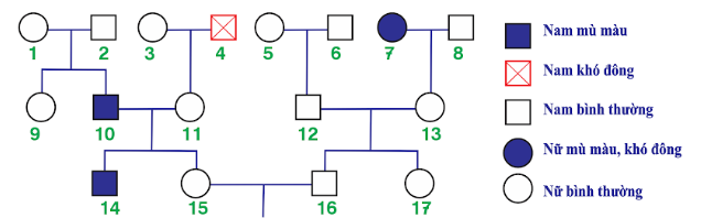 Cho sơ đồ phả hệ sau đây về bệnh mù màu và máu khó đông. Biết bệnh mù màu là do gene lặn