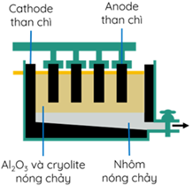 Sản phẩm điện phân ở cathode là nhôm (lỏng) và ở anode là hỗn hợp khí CO2, CO. Cấu tạo bể điện phân như hình sau: