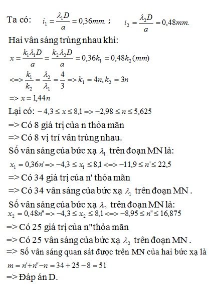 Trong thí nghiệm I-âng, cho a = 1,5 mm, D = 1,2 m. Chiếu đồng thời hai bức xạ có bước sóng λ1 = 0,45 μm và λ2 = 600 nm. Trên màn quan sát, gọi M, N là hai điểm ở khác phía so với vân trung tâm và cách vân trung tâm lần lượt là 4,3 mm và 8,1 mm. Số vân sáng quan sát được trên MN của hai bức xạ là