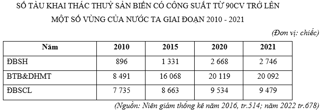 Căn cứ bảng số liệu trên, để thể hiện tốc độ tăng trưởng số tàu khai thác thuỷ sản biển có công suất từ 90 CV trở lên một số vùng của nước ta giai đoạn 2010 – 2021, dạng biểu đồ nào sau đây là thích hợp nhất?
