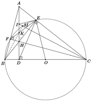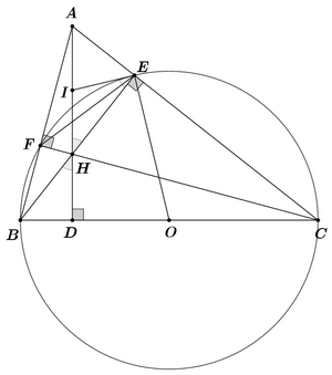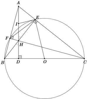 a) Chúng minh tứ giác \(BFEC\) nội tiếp. Xác định tâm \(O\)của đường tròn ngoại tiểp tứ giác \(BFEC\)