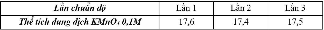 - Lấy 10,0 mL dung dịch X vào trong cốc thuỷ tinh, thêm tiếp dung dịch H2SO4 1M (dư) rồi chuẩn độ bằng dung dịch KMnO4 0,1M. Kết quả chuẩn độ, thể tích (mL) dung dịch KMnO4 0,1M sử dụng qua 3 lần chuẩn độ như sau: