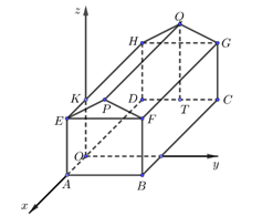 Một kho chứa hàng có dạng hình lăng trụ đứng \(ABFPE.DCGQH\) với \(ABFE\) là hình chữ nhật và \(EFP\) là tam giác cân tại \(P\). Gọi \(T\) là trung điểm của \(DC\). Các kích thước của kho chứa lần lượt là \(AB = 6\)m;\(AE = 5\)m; \(AD = 8\)m; \(QT = 7\)m. Người ta mô hình hoá nhà kho bằng cách chọn hệ trục toạ độ có gốc toạ độ là điểm \(O\) thuộc đoạn \(AD\) sao cho \(OA = 2\)m và các trục toạ độ tương ứng như hình vẽ dưới đây.