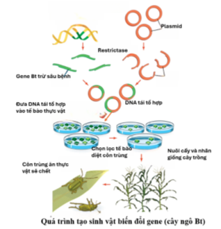 | c) Bt là loài sinh vật biến đổi gene, restrictase là enzyme cắt giới hạn. | ||