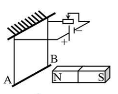 Một đoạn dây dẫn AB được treo trên những sợi dây đồng mảnh, nhẹ, không dãn và được kết nối với nguồn điện một chiều như hình vẽ bên. Ngay sát bên phải của đoạn dây dẫn là cực bắc của nam châm vĩnh cửu. Ở vị trí của đoạn dây, các đường sức từ do nam châm gây ra có phương nằm ngang. Thanh trượt biến trở được di chuyển nhẹ nhàng sang bên phải.