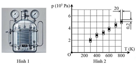 Một nhóm học sinh tiến hành thì nghiệm đo số mol của một lượng khí không đổi, bằng cách khảo sát mối quan hệ giữa áp suất p và nhiệt độ T. Trong thí nghiệm, các em sử dụng: một bình kín có dung tích V = 5 l chứa khí; nhiệt kế; áp kế. Các bạn học sinh tiến hành tăng từ từ nhiệt độ của khí và ghi lại số liệu áp suất tương ứng. Từ số liệu ghi được, nhóm học sinh vẽ đồ thị mô tả sự phụ thuộc của áp suất vào nhiệt độ (Hình 2). Mỗi giá trị áp suất ứng với một giá trị nhiệt độ, được biểu diễn bằng một điểm nằm trong ô chữ nhật, kính thước ô chữ nhật cho biết sai số khi đo nhiệt độ \(\Delta T\), sai số khi đo áp suất là \(\Delta p\).