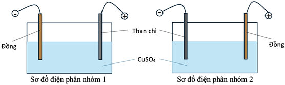 Hai nhóm học sinh tiến hành thí nghiệm điện phân dung dịch CuSO4 với một điện cực than chì và một điện cực bằng đồng (bỏ qua sự thay đổi thể tích của dung dịch khi điện phân).