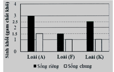 | c) Khi sống chung với loài (C), tỉ lệ phần trăm lượng sinh khối giảm của loài (A) lớn hơn so với loài (F), loài (K). | ||