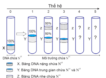| c) Ở thế hệ thứ 4, tỉ lệ vi khuẩn chứa DNA ở vị trí băng Z là 12,5%. | ||