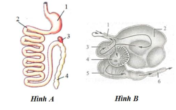 Hình A và hình B mô tả mô tả ống tiêu hóa của hai loài thú, trong đó một loài là thú ăn thịt, một loài là thú nhai lại. Quan sát hình và cho biết, cấu trúc số mấy ở hình B có hoạt động tiêu hóa tương tự như cấu trúc số 1 ở hình A?