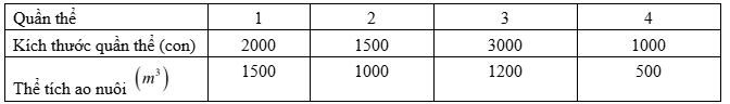 Cho biết điều kiện sinh thái ao nuôi của 4 quần thể giống nhau, không có hiện tượng xuất cư và nhập cư. Quần thể số mấy có thể xuất hiện cạnh tranh cùng loài cao nhất?