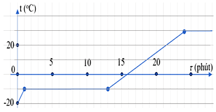 Một vật đơn chất từ trạng thái rắn, được cung cấp nhiệt với công suất không đổi. Đồ thị (hình bên) thể hiện sự thay đổi nhiệt độ \(t\left( {^0C} \right)\) của khối chất theo thời gian \(\tau \) (phút). Bỏ qua sự trao đổi nhiệt với môi trường.