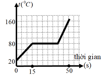 Một lượng chất lỏng được đựng trong một bình nhiệt lượng kế. Người ta truyền nhiệt lượng cho chất lỏng bằng một nguồn nhiệt với công suất tỏa nhiệt không đổi (coi toàn bộ nhiệt lượng cung cấp đều chuyển hóa thành nội năng của chất này). Hình bên là đồ thị biểu diễn sự phụ thuộc nhiệt độ của chất này theo thời gian. Nhiệt dung riêng của chất này ở thể lỏng là 2800 J/kg.K.