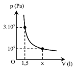 Một lượng khí lí tưởng thực hiện quá trình biến đổi trạng thái được biểu diễn trong hệ tọa độ (p,V) bằng một nhánh của đường hypebol như hình vẽ. Giá trị của x trong hình vẽ (kết quả làm tròn đến hàng phần chục).