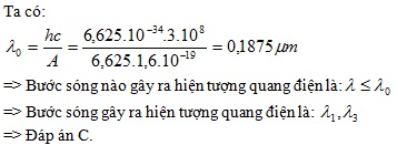 Kim loại dùng làm catốt của một tế bào quang điện có công thoát electron A = 6,625 eV. Lần lượt chiếu vào catốt các bước sóng: λ1 = 0,1875μm; λ2 = 0,1925μm; λ3 = 0,1685μm. Bước sóng nào gây ra hiện tượng quang điện ?