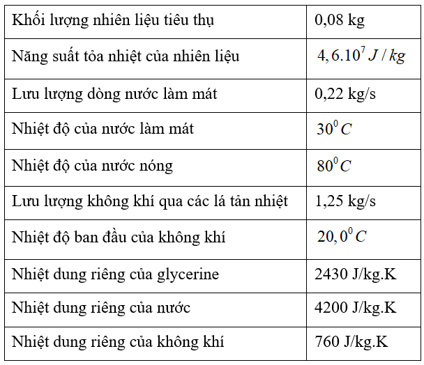 Hình vẽ bên dưới biểu diễn hệ thống làm mát của động cơ ô tô. Trong một lần thử nghiệm hệ thống này, các số liệu được thống kê ở bảng bên dưới. Cho rằng, khi nhiên liệu bị đốt cháy hoàn toàn thì 30% nhiệt năng từ nhiên liệu sẽ chuyển hóa thành cơ năng có ích.