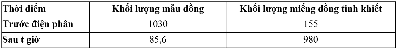 - Khối lượng các điện cực trước và sau điện phân được ghi lại trong bảng dưới đây: