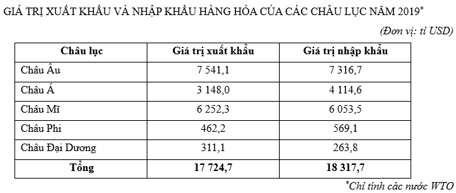 | b) Châu Đại Dương có tổng giá trị xuất nhập khẩu nhỏ nhất. | ||