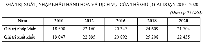 | b) Giá trị xuất khẩu và giá thị nhập khẩu có xu hướng tăng liên tục trong giai đoạn 2010 - 2020. | ||