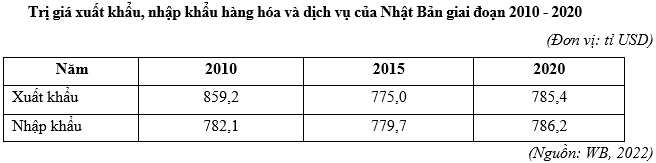 Cho bảng số liệu: Căn cứ vào bảng số liệu trên, tính cán cân xuất nhập khẩu của Nhật