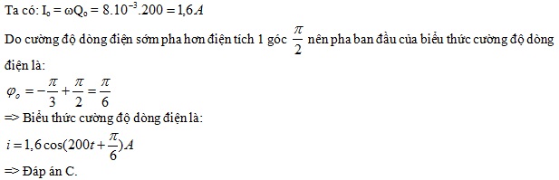 Trong dao động tự do của mạch LC, điện tích trên bản tụ điện có biểu thức q = 8.10-3 cos(200t – π/3) (C). Biểu thức cường độ dòng điện qua cuộn dây là: