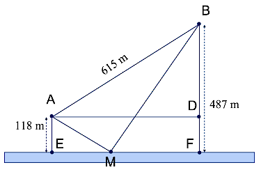 Cho hai vị trí A, B cách nhau 615 m, cùng nằm về một phía bờ sông như hình vẽ. Khoảng cách từ A và từ B đến bờ sông lần lượt là 118 m và 487 m. Một người đi từ A đến bờ sông để lấy nước mang về B. Đoạn đường ngắn nhất mà người đó có thể đi là: