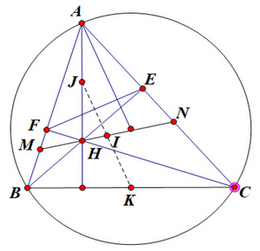c) Đường phân giác góc FHB cắt AB và AC lần lượt tại M và N. Gọi I là trung điểm của MN, J là trung điểm của AH. Chứng minh tứ giác AFHI nội tiếp và ba điểm I, J, K thẳng hàng.