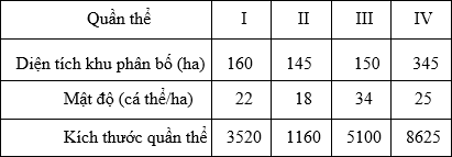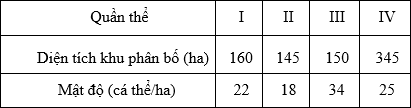 Giả sử 4 quần thể của một loài thú được kí hiệu là I, II, III và IV có diện tích khu phân bố và mật độ cá thể như sau: