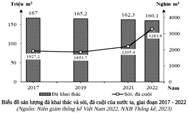 Dựa vào sản lượng đá khai thác; sỏi, đá cuội giai đoạn 2017 – 2022 và lựa chọn nhận xét đúng.