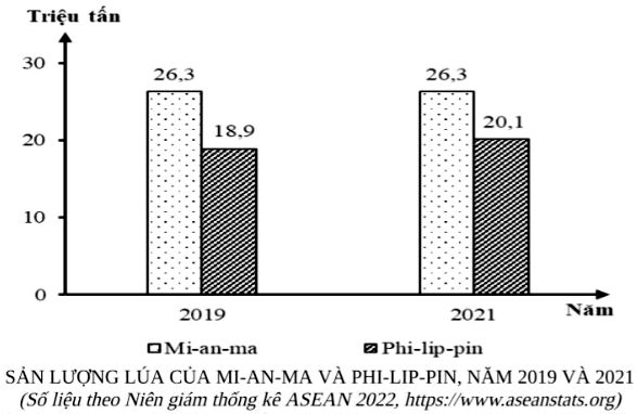 Dựa vào biểu đồ, xác định sản lượng lúa của Mi-an-ma và Phi-líp-pin giai đoạn 2019 – 2021 và nhận xét, suy luận.