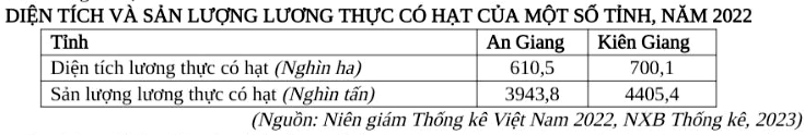 Theo bảng số liệu, hãy cho biết năng suất lương thực có hạt năm 2022 của tỉnh An Giang cao hơn năng suất của tỉnh Kiên Giang bao nhiêu tạ/ha (làm tròn kết quả đến 1 chữ số thập phân)