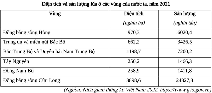 | b) Sản lượng lúa phân theo vùng năm 2021 ở nước ta có sự khác nhau. | ||