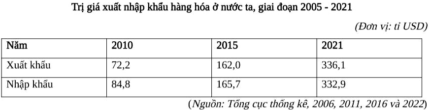 Cho bảng số liệu: Cho biết tỉ trọng nhập khẩu hàng hóa nước ta trong giai đoạn 2010 - 2021