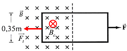 Một phần của khung dây hình chữ nhật có kích thước như hình bên được đặt trong một vùng từ trường đều có cảm ứng từ 0,55 T. Tổng điện trở của vòng dây là $0,23\Omega$. Bỏ qua tác dụng của trọng lực. Lực cần thiết để kéo khung dây ra khỏi từ trường (sang phải) với vận tốc không đổi 3,10 m/s là bao nhiêu N (làm tròn kết quả đến chữ số hàng phần mười)?
