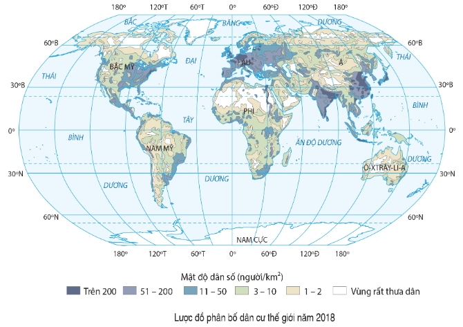 | b) Các khu vực tập trung đông dân cư, có mật độ dân số cao là Đông Á, Đông Nam Á, Nam Á, phần lớn châu Âu (ở các vĩ độ thấp dưới 60⁰), phía đông của lục địa Bắc Mĩ, rìa đông và đông nam của lục địa Nam Mỹ, hạ lưu sông Nin,… | ||