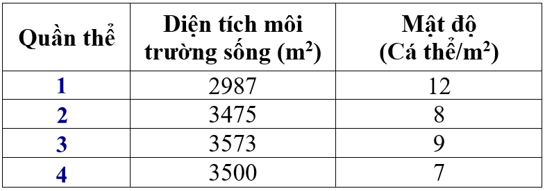Các quần thể của cùng 1 loài có mật độ và diện tích môi trường sống tương ứng như sau: