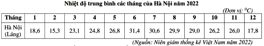 Căn cứ vào bảng số liệu trên, hãy cho biết nhiệt độ trung bình năm của Hà Nội năm 2022 là bao nhiêu "C? (làm tròn kết quả đến một chữ số thập phân).