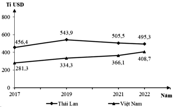 Cho biểu đồ: TỔNG SẢN PHẨM TRONG NƯỚC (GDP) CỦA THÁI LAN VÀ VIỆT NAM GIAI ĐOẠN 2017 - 2022(Số