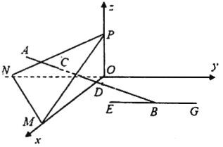 Trong không gian Oxyz (đơn vị trên mỗi trục tọa độ là killômét), một máy bay đang ở vị trí $A(4; - 0,5;0,5)$ và sẽ hạ cánh ở vị trí $B(3;2,5;0)$ ở trên đường băng EG (hình vẽ). Có một lớp mây được mô phỏng bởi mặt phẳng $(\alpha)$ đi qua ba điểm $M(8;0;0),$$N(0; - 8;0)$ và $P(0;0;0,8)$.