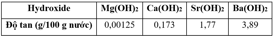 Cho độ tan của các hydroxide kim loại nhóm IIA ở 20oC như