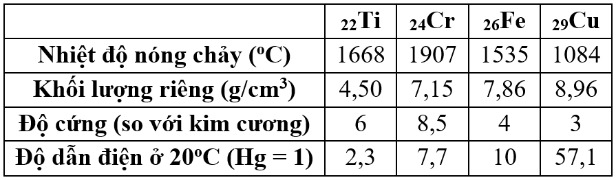 Cho các thông số vật lý dưới bảng sau:Cho các nhận định sau:(a) Chromium có độ cứng lớn