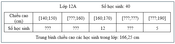 Trong quá trình khảo sát chiều cao của các bạn học sinh trong lớp, lớp trưởng Hùng có ghi lại thông tin vào một tờ giấy có bảng số liệu. Tuy nhiên, do không cẩn thận nên Hùng đã làm đổ mực vào tờ giấy, dẫn đến việc một số chỗ trong tờ giấy không thể nhìn được. Hiện tại, các thông tin ghi trên tờ giấy được thể hiện như sau: