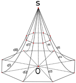 Gia đình ông Bình xây một cái chòi hình bát giác, trong đó mái chòi $(H)$ có dạng hình "chóp bát giác cong đều" có trần bằng gỗ như hình vẽ bên dưới. Đáy của $(H)$ là một hình bát giác đều có cạnh là $a = \dfrac{3\sqrt{2\sqrt{2} + 4}}{\sqrt{2} + 2}(m)$. Chiều cao $SO = 6m$ (SO vuông góc với mặt phẳng đáy). Các cạnh bên của $(H)$ là các sợi dây thép $d_{1};d_{2};d_{3};d_{4};d_{5};d_{6};d_{7};d_{8}$ nằm trên các đường parabol có trục đối xứng song song với SO. Giả sử giao tuyến (nếu có) của $(H)$ với mặt phẳng $(\alpha)$ vuông góc với SO là một bát giác đều và khi $(\alpha)$ đi qua trung điểm của SO thì bát giác đều có cạnh $b = \dfrac{\sqrt{2\sqrt{2} + 4}}{\sqrt{2} + 2}(m)$. Tính thể tích theo đơn vị $m^{3}$ phần không gian nằm bên trong mái chòi $(H)$ (làm tròn kết quả đến hàng phần chục, coi bề dày trần gỗ không đáng kể).