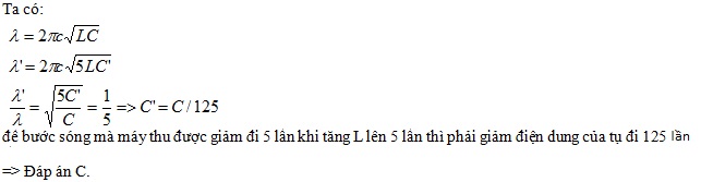 Một máy thu sóng điện từ có L, C có thể thay đổi. Khi L tăng 5 lần thì C phải tăng hay giảm bao nhiêu lần để bước sóng mà máy thu được giảm đi 5 lần?