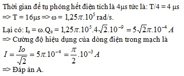 Một mạch dao động điện từ LC, ở thời điểm ban đầu điện tích trên tụ đạt cực đại Q0 = 4√2.10-9 C. Thời gian để tụ phóng hết điện tích là 4μs. Cho p2 = 10. Cường độ hiệu dụng của dòng điện trong mạch là
