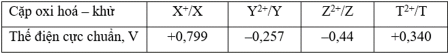Cho biết thế điện cực của các kim loại X, Y, Z, T như sau