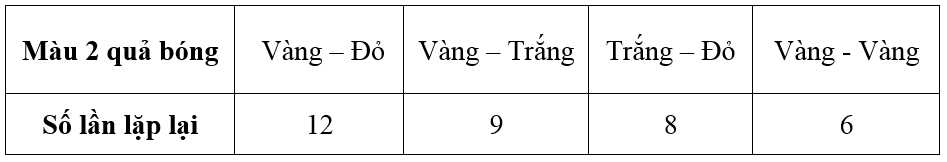 Trong hộp có 2 bóng vàng, 1 bóng trắng và 1 bóng đỏ. Mai lấy ngẫu nhiên 2 viên quả bóng từ trong hộp 35 lần. Hòa đếm số lần xuất hiện màu của hai quả bóng được kết quả sau: